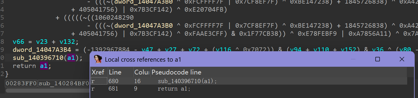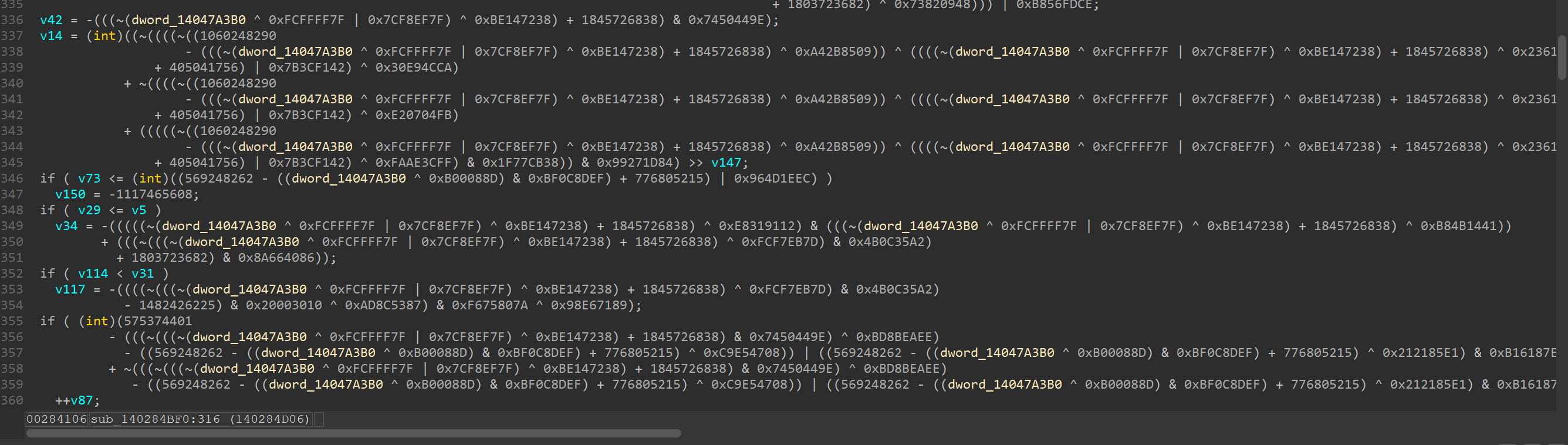 At 0x140081300 we can find unobfuscated logic of AES key = XOR(sha256(A||fmt(time())), sha256(C)), but expect there, the MBA obf (Mixed Boolean-Arithmetic Obfuscation) is everywhere: