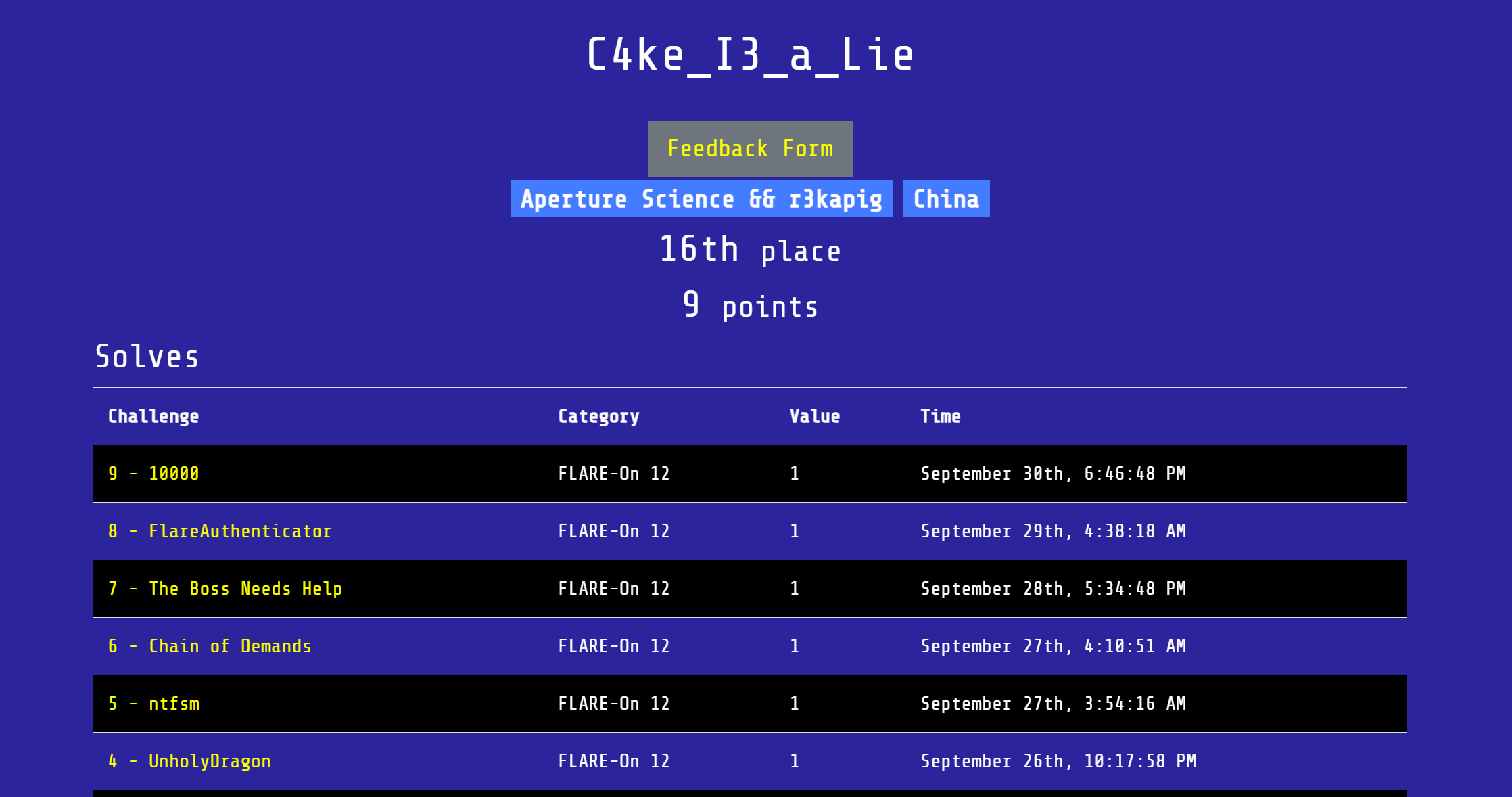 In September of last year, @crazyman told me about an ongoing reverse-engineering CTF. That was the first time I learned about Flare-On (and also that it used to be part of Mandiant and is now owned by Google). With the experience from last year, I decided to dedicate myself more to this year’s competition and see if I could achieve a good result. In the end, I completed all the challenges in 4 days, 21 hours, and 33 minutes.